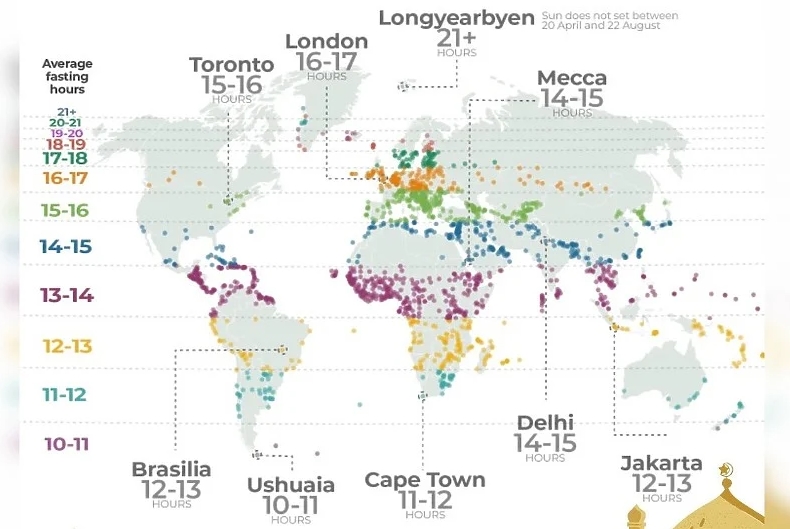 Muslimani koji žive u najjužnijim zemljama svijeta, poput Čilea ili Novog Zelanda, postit će u prosjeku 12 sati, dok će oni koji žive u najsjevernijim zemljama, poput Islanda ili Grenlanda, postiti više od 17 sati.
