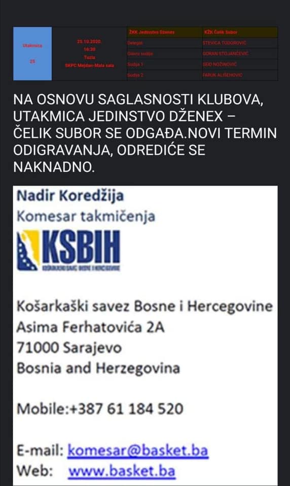 Odgođena utakmica KK Jedinstvo – KŽK Čelik Zenica – Utakmica između KK “Jedinstvo Dženex” – KK “Čelik Subor” se odgađa.