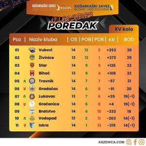 Nakon 15.kola KK Vukovi su prvi na tabeli sa 26 bodova, omjer 12 pobjeda i dva poraza, druge su Živinice sa omjerom od 12 pobjeda i jednim porazom, 25 bodova, treći je Star sa 23 boda, četvrti Bihać sa 22 boda i t.d., dok su na začelju Iskra i Vodopad sa po 14 bodova.