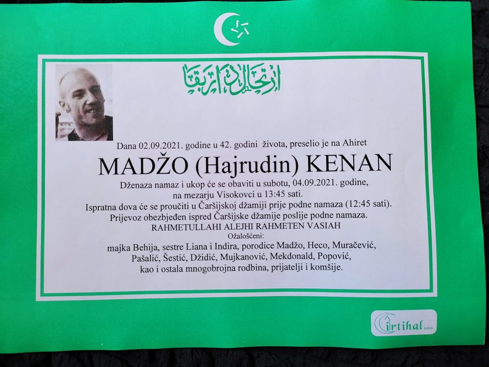 Sinoć smo obavjestili sugrađane o smrti našeg Kenana Madže, informacija NA OVOM LINKU. Ukop našeg sugrađanina je sutra (subota) u 13:45h na mezarju u Visokocima na Grmu. Ispratna dova je u Čaršijskoj džamiji u12:45h, prijevoz je obezbjeđen ispred Čaršijske džamije, poslije podne namaza.