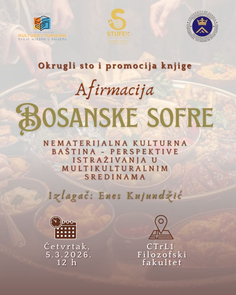 Na Filozofskom fakultetu Univerziteta u Zenici u četvrtak, 5. marta 2026. godine, održan je okrugli sto i promocija knjige Afirmacija bosanske sofre: nematerijalna kulturna baština – perspektive istraživanja u multikulturalnim sredinama. Događaj su organizirali članovi Studijskog programa Kultura i turizam, a realiziran je u okviru programa Drugog studentskog festivala kulture STUFEK 2026.