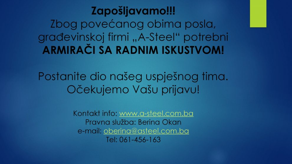 Oglas za posao: armirači sa radnim iskustvom- Građevinskoj firmi, zbog povećanog obima posla, potrebni ARMIRAČI SA RADNIM ISKUSTVOM.