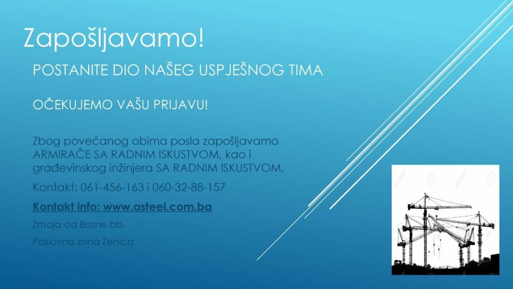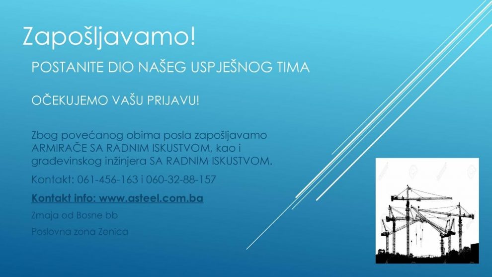 Zbog povećanog obima posla firmi “A-Steel” Zenica potrebni su armirači sa radnim iskustvom kao i inžinjer građevine sa radnim iskustvom.