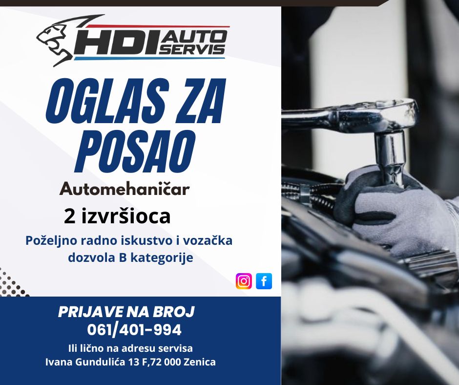 Autoservis HDi, renomirani autoservis u Zenici, traži dva nova radnika za rad u svom timu. Posao obuhvata servisiranje i popravku svih brendova motornih vozila, dijagnostiku, kao i sve druge aktivnosti vezane za održavanje vozila.