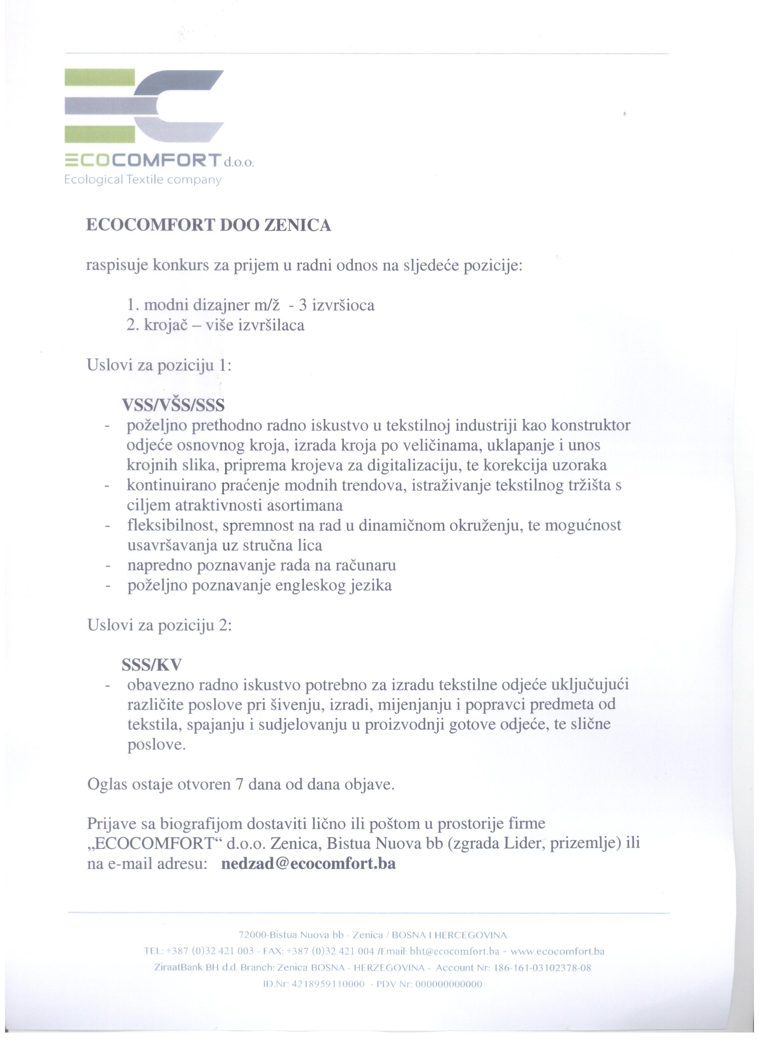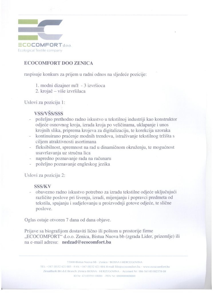 Prijave sa biografijom dostaviti lično ili poštom u prostorije firme „ECOCOMFORT“ d.o.o. Zenica, Bistua Nuova bb (zgrada Lider, prizemlje) ili na e-mail adresu: [email protected]