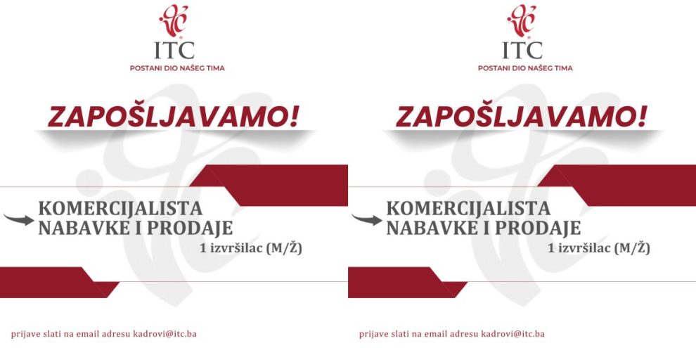 Oglas za posao: Komercijalista nabavke i prodaje – Na osnovu ukazanih potreba Generalni direktor ITC Zenica d.o.o. raspisuje oglas za popunu upražnjenih radnih mjesta: