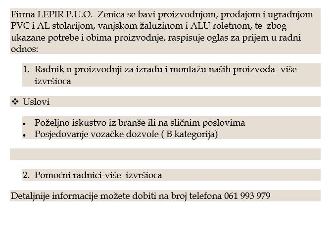 Firma LEPIR P.U.O. Zenica se bavi proizvodnjom, prodajom i ugradnjom PVC i AL stolarijom, vanjskom žaluzinom i ALU roletnom, te zbog ukazane potrebe i obima proizvodnje, raspisuje oglas za prijem u radni odnos: