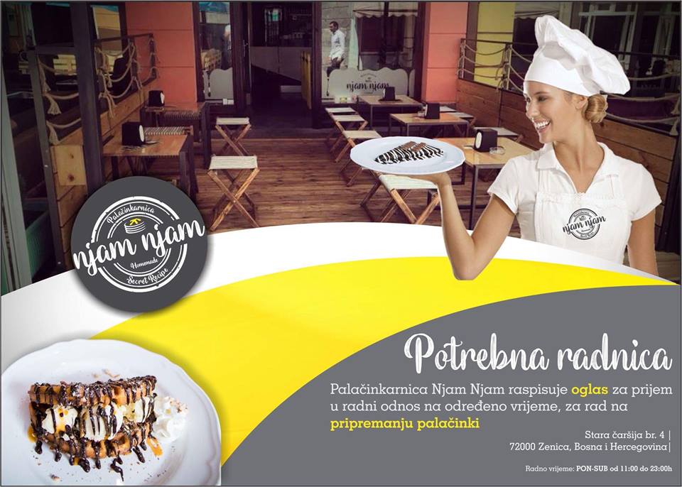 Oglas za posao: Palačinkarnica Njam Njam – Palačinkarnica Njam Njam raspisuje oglas za prijem u radni odnos na određeno vrijeme, za rad na pripremanju palačinki.