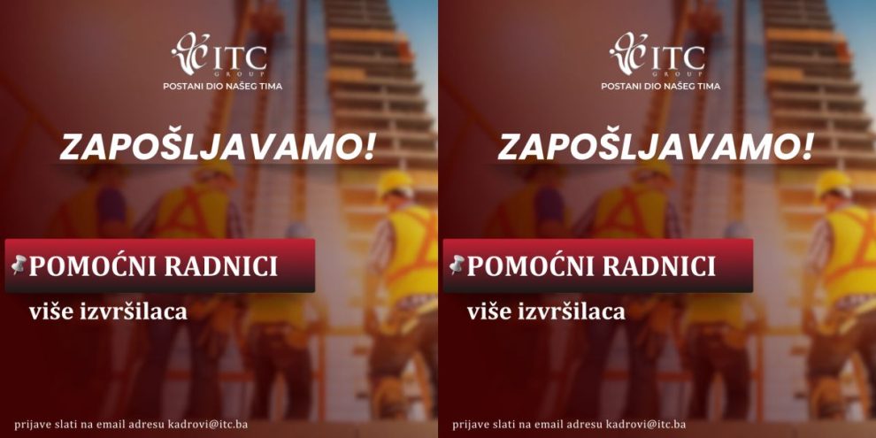 Oglas za posao: Pomoćni radnici za građevinske radove, strojne i hidro instalacije- Zbog povećanja obima poslovanja objavljujemo oglas za popunu sljedećih radnih mjesta: