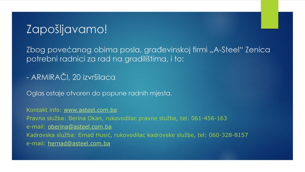 Oglas za posao: potrebno 20 armirača- Građevinskoj firmi “A-Steel” u Zenici, potrebni radnici za rad na gradilištima, i to: