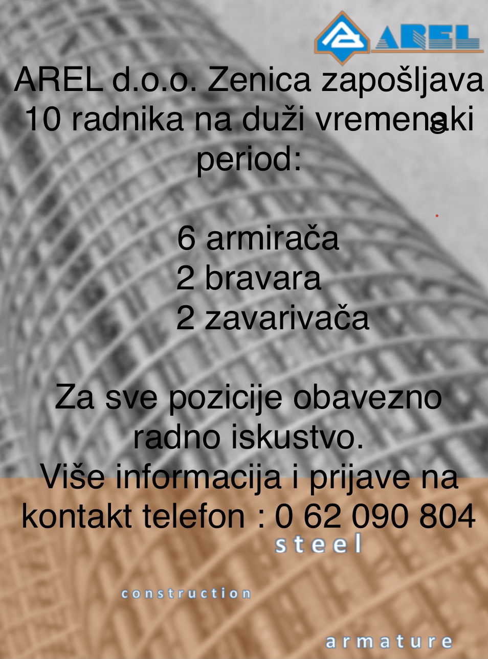 Oglas za posao: potrebno šest armirača, dva bravara i dva zavarivača- Firma Arel d.o.o Zenica zapošljava 10 radnika: