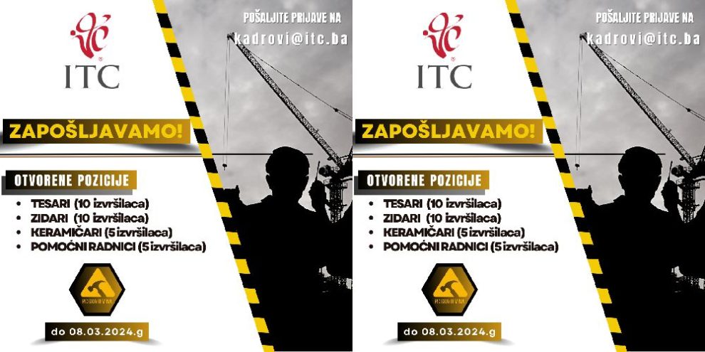 Na osnovu iskazanih potreba Generalni direktor Društva ITC Zenica d.o.o., objavljuje oglas za popunu upražnjenih radnih mjesta: