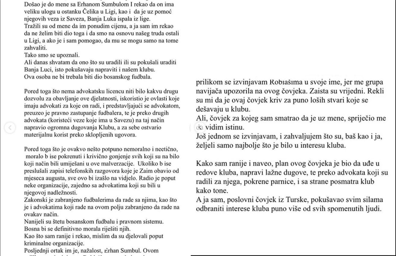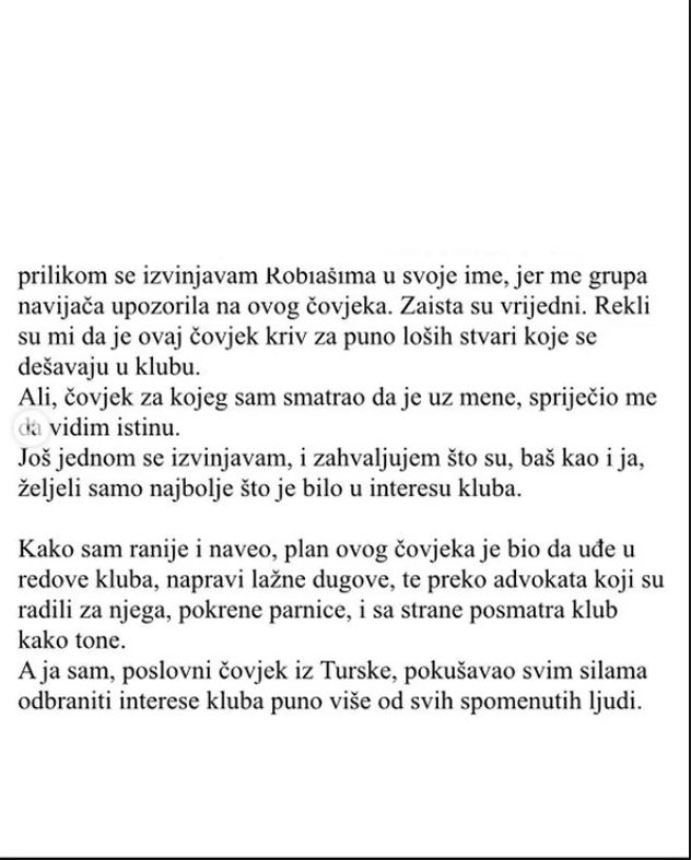 Sada već bivši vlasnik zeničkog Čelika Aydin Olgun nastavlja s otkrivanjem detalja koji su se dešavali tokom njegovog mandata. U oproštajnom intervjuu turski biznismen je govorio o razlozima odlaska sa mjesta prvog čovjeka kluba, a video je objavljen na Instagram profilu Čelika u trajanju od skoro 32 minute. Olgun je tada, između ostalog, rekao da je “saznao da uopće ne posjeduje 70 posto upravljačkih prava te da je doveden u zabludu i prevaren”.