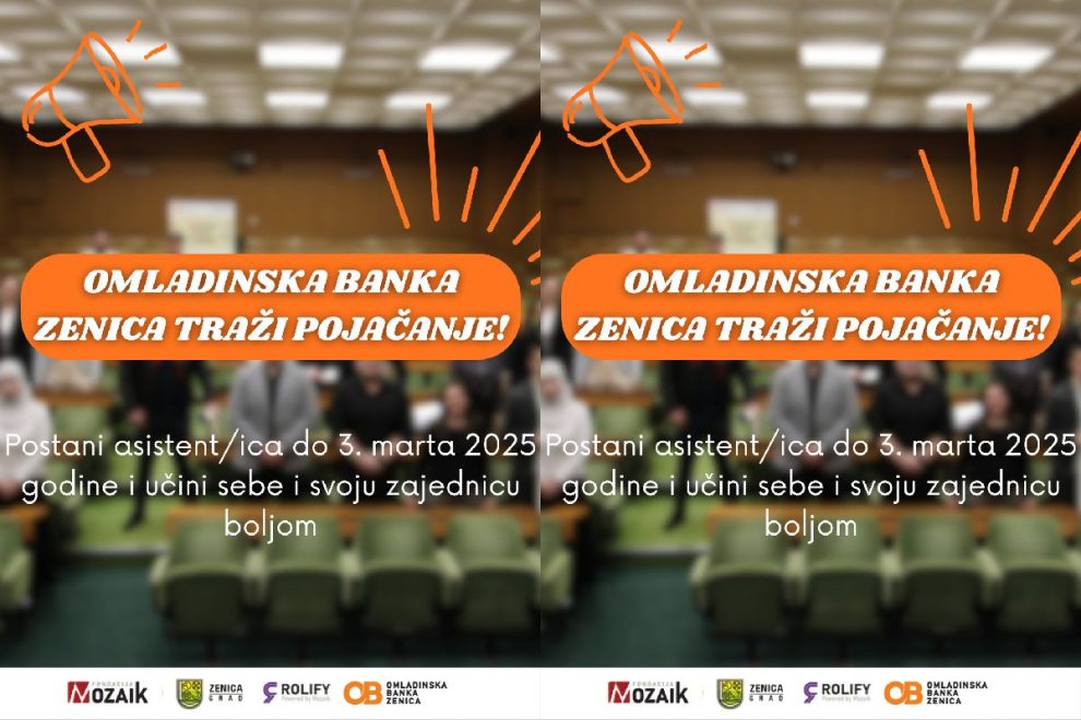Grad Zenica, u partnerstvu sa Fondacijom Mozaik, poziva mlade iz lokalne zajednice da se prijave za poziciju asistentice ili asistenta Omladinske banke Zenica.