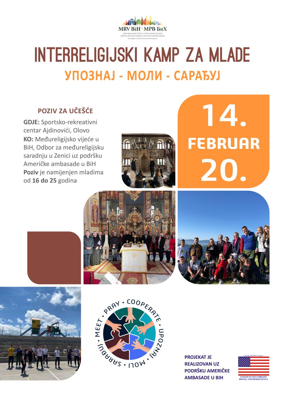 Odbor za međureligijsku saradnju u Zenici – Međureligijskog vijeća BiH, uz podršku Ambasade Sjedinjenih Američkih Država, organizuje Interreligijski kamp mladih, koji će se održati od 14. do 20. februara 2022., u prostoru Sportsko-rekreacijskog centra “Ajdinovići” – Olovo, pod nazivom “Upoznaj-moli-sarađuj”