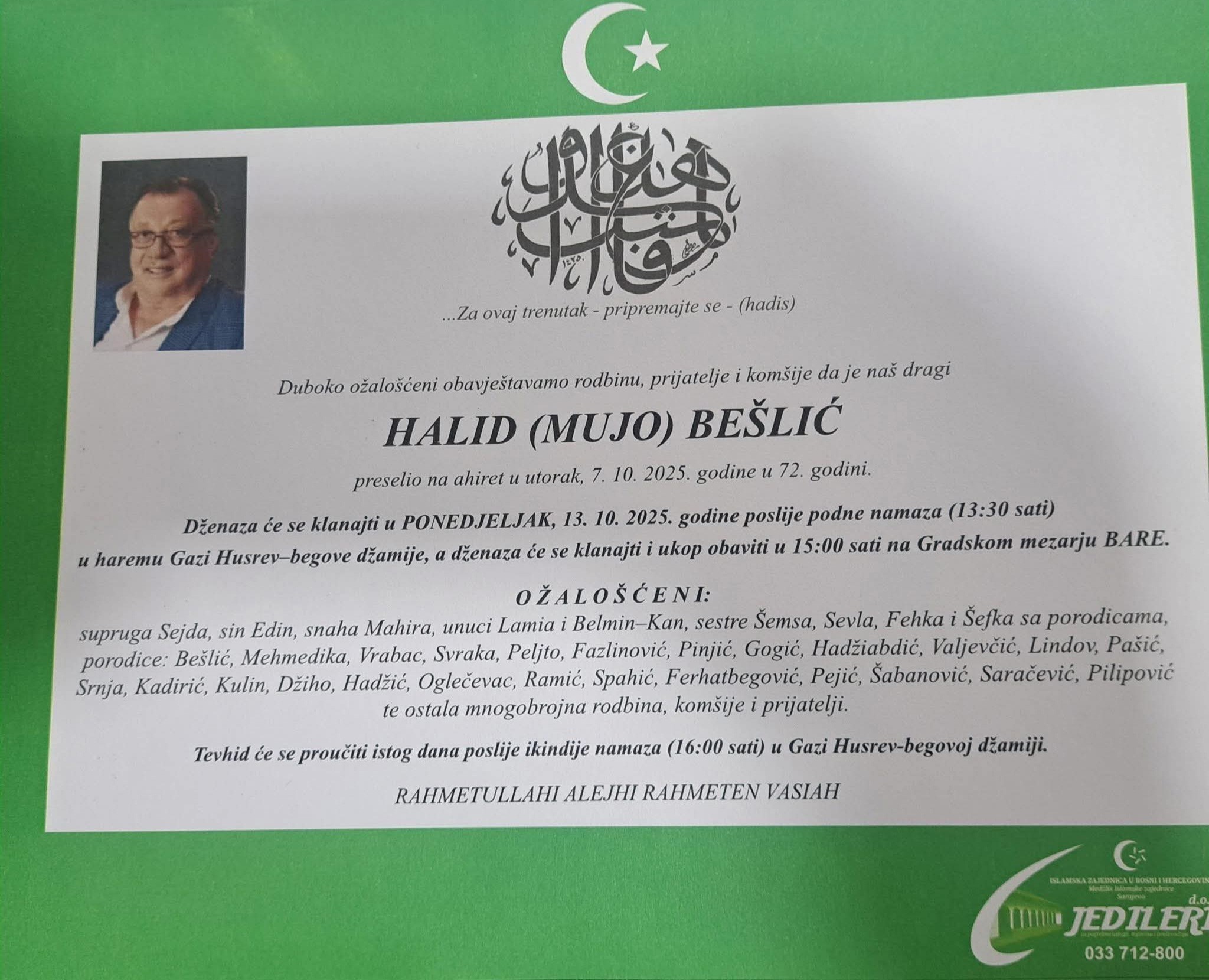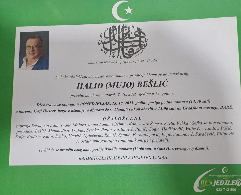 Legendarni pjevač Halid Bešlić preminuo je jučer u Sarajevu, a danas je objavljena smrtovnica koja potvrđuje oproštaj od čovjeka koji je svojim talentom i toplinom spajao ljude.