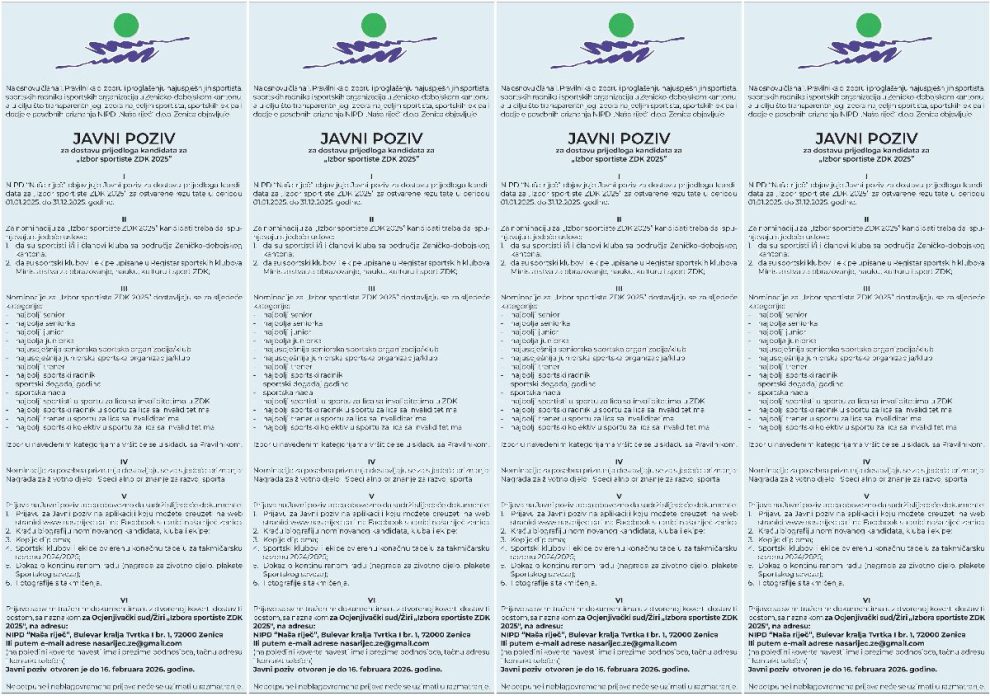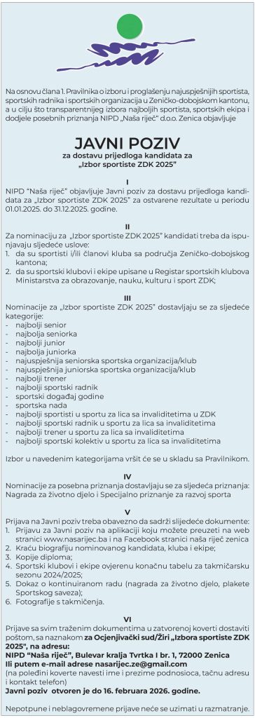 NIPD „Naša riječ“ i ove godine organizuje tradicionalnu manifestaciju izbora Sportiste Zeničko-dobojskog kantona 2025, a tim povodom otvoren je javni poziv za dostavljanje prijedloga kandidata.