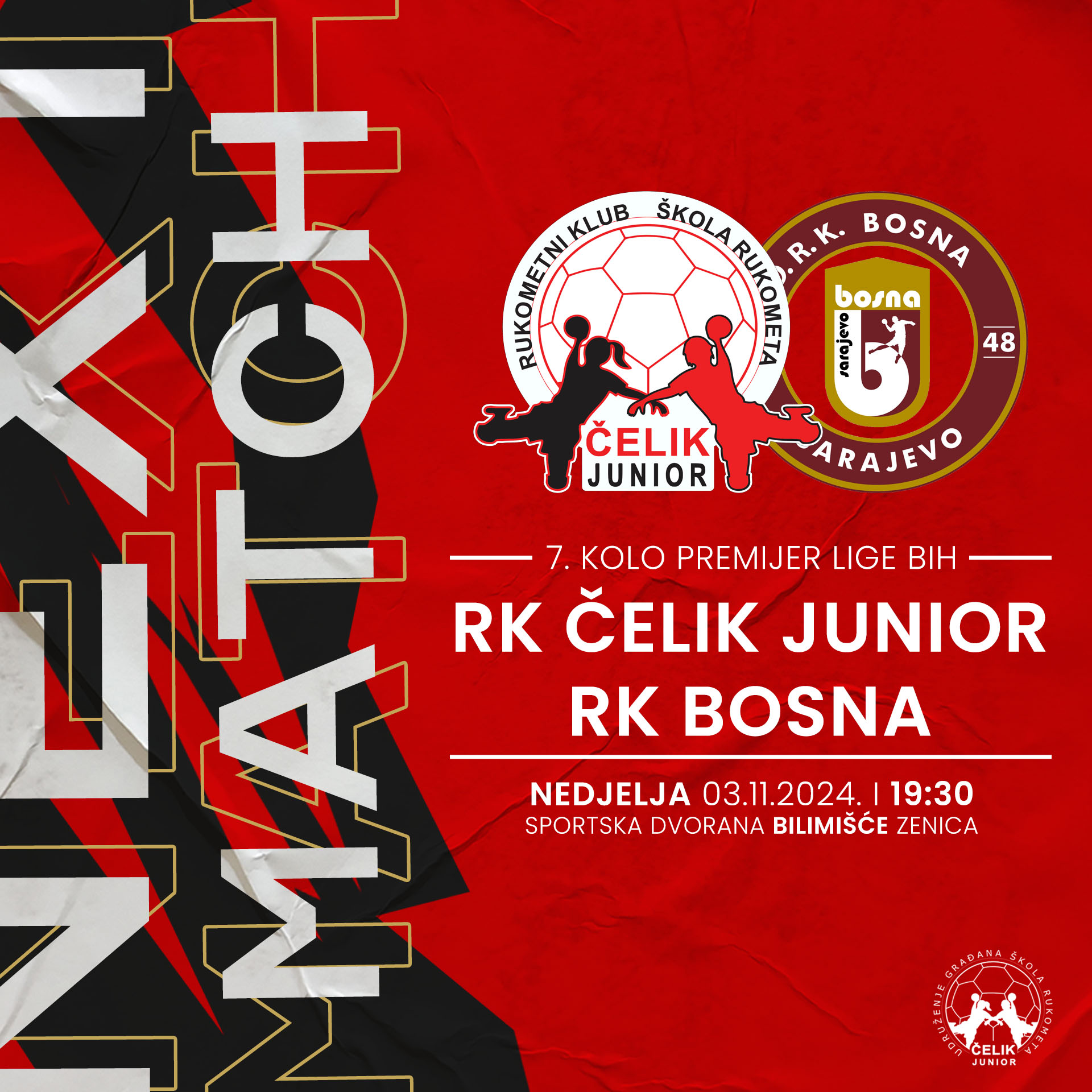 U nedjelju od 8:30 sati u sportskoj dvorani Bilmišće, omladinske kategorije RK Čelik Junior odigrat će svoje utakmice Omladinske lige protiv RK Gračanica. #rkČelikJunior.