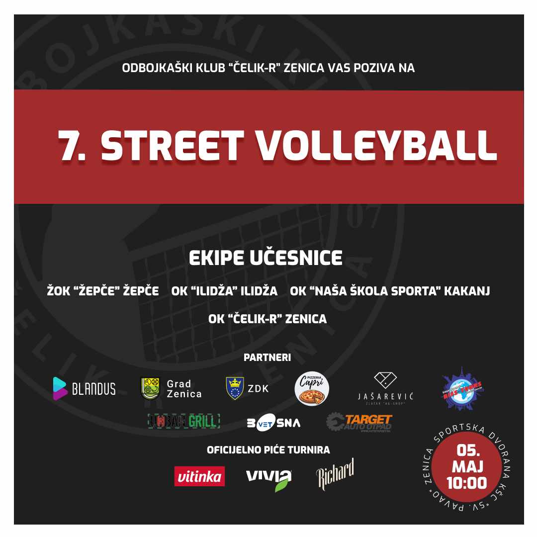 Odbojkaški klub “Čelik-R” Zenica s ponosom najavljuje 7. “Street Volleyball” turnir koji će se održati u Zenici u nedjelju 05.05.2024. godine.