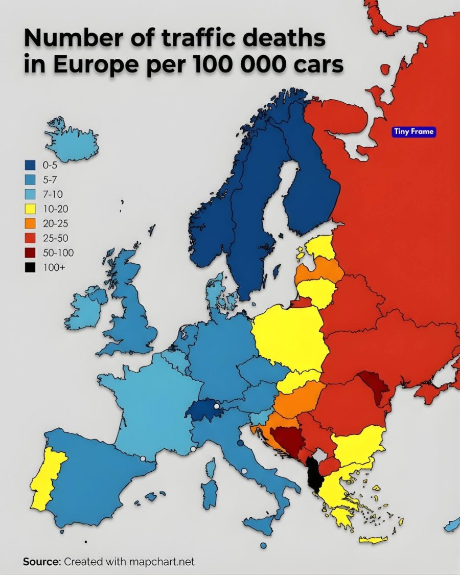 S druge strane, sjeverna i zapadna Europa imaju neke od najnižih stopa smrtnosti u prometu u svijetu, brojke se drastično penju dok se krećete prema istoku.