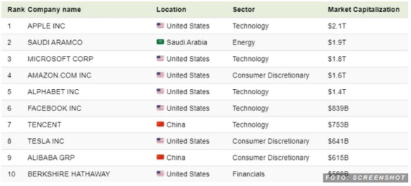 Kako se vidi, najvrijednij svjetska kompanija je Apple, a slijedi saudijski naftni div Saudi Aramco: