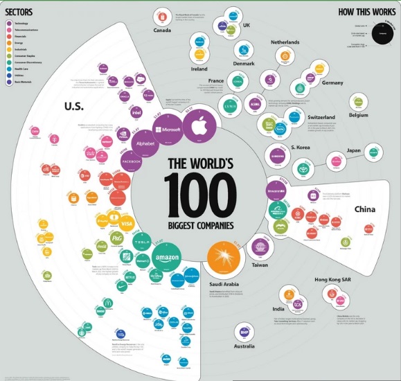 U grafici su korišteni podaci PwC za prikazivanje najvećih svjetskih kompanija tržišnom kapitalizacijom, kao i zemalja i sektora iz kojih dolaze.