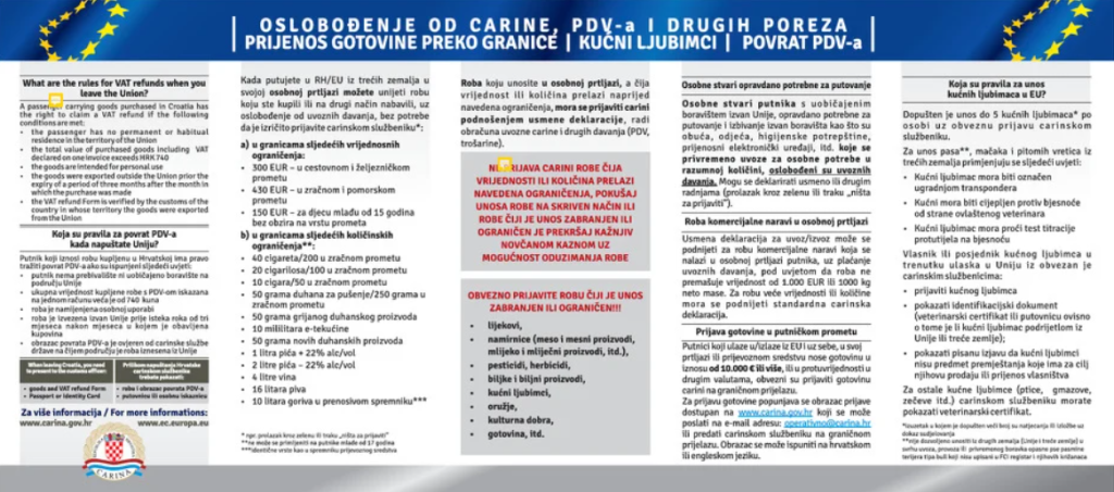 Carinska uprava Republike Hrvatske objavila je informacije za putnike u kojima su pojašnjena carinska pravila, ograničenja i oslobađanja koja se primjenjuju prilikom provođenja mjera carinskog nadzora na hrvatskim, odnosno evropskim granicama.