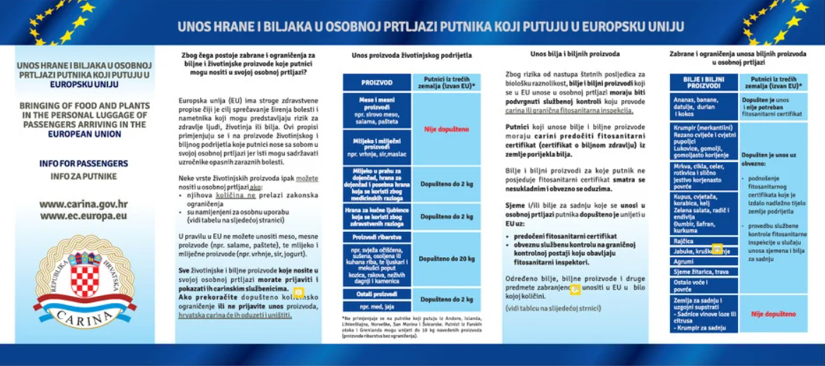 Sve životinjske i biljne proizvode koje putnici nose u svom prtljažniku, moraju se prijaviti carinskim službenicima. Ukoliko dođe do prekoračenja količinskog ograničenja ili putnici ne prijave unos, carinar ih može oduzeti i uništiti.