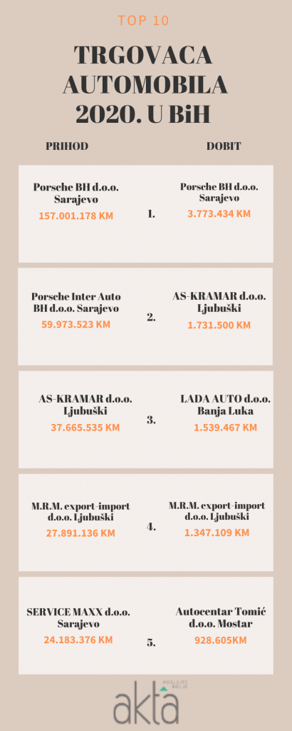 Pregled je napravljen po ostvarenoj dobiti i prihodima u 2020. godini, a lidersku poziciju zauzeo je kao i prošle godine zauzeo sarajevski Porsche BH sa prihodom od 157 miliona KM. Dobit kompanije iznosila je 3,7 miliona KM, dok je 2019. iznosila 4,6 miliona KM.