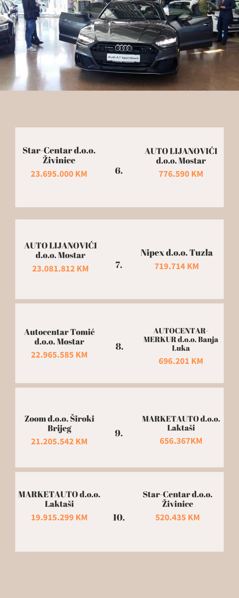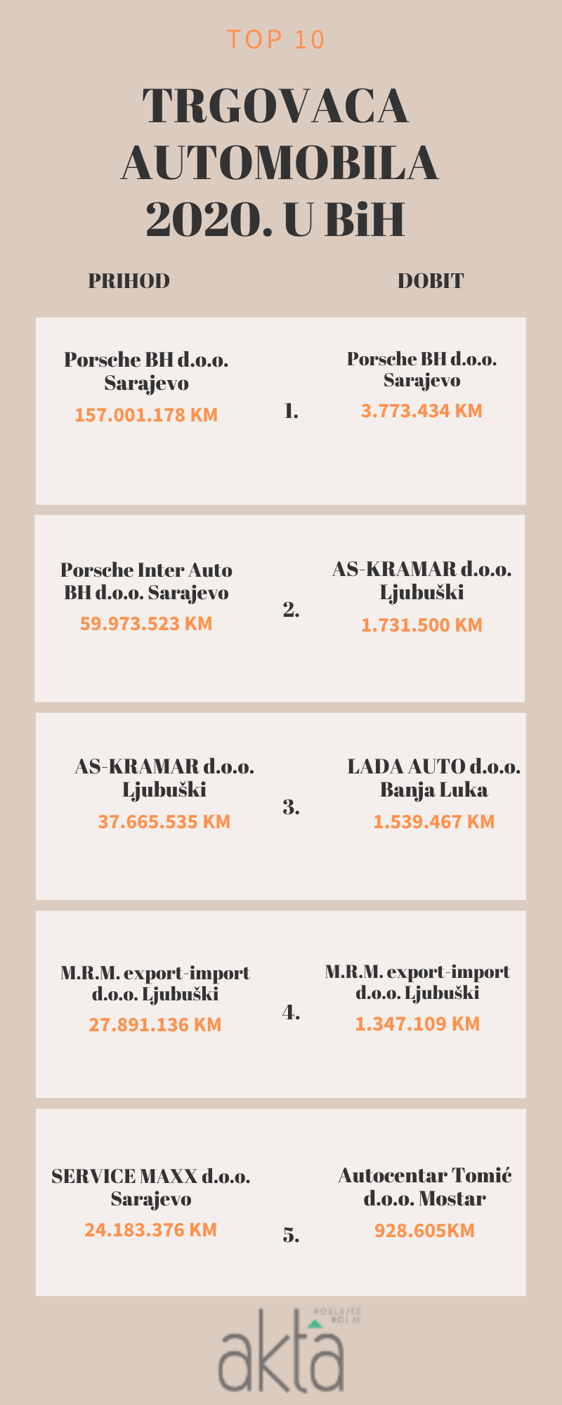 Pregled je napravljen po ostvarenoj dobiti i prihodima u 2020. godini, a lidersku poziciju zauzeo je kao i prošle godine zauzeo sarajevski Porsche BH sa prihodom od 157 miliona KM. Dobit kompanije iznosila je 3,7 miliona KM, dok je 2019. iznosila 4,6 miliona KM.