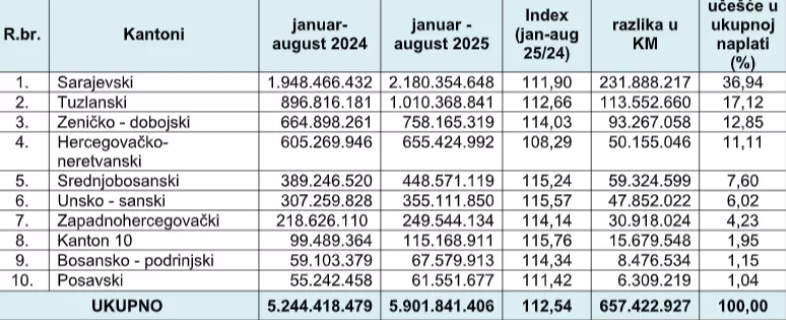 Porezna uprava Federacije BiH obavještava javnost da su porezni obveznici Federacije BiH u periodu januar-avgust 2025. godine uplatili 5.901.841.406 KM javnih prihoda, što je u odnosu na isti period 2024. godine više za 657.422.927 KM, ili za 12,54%.