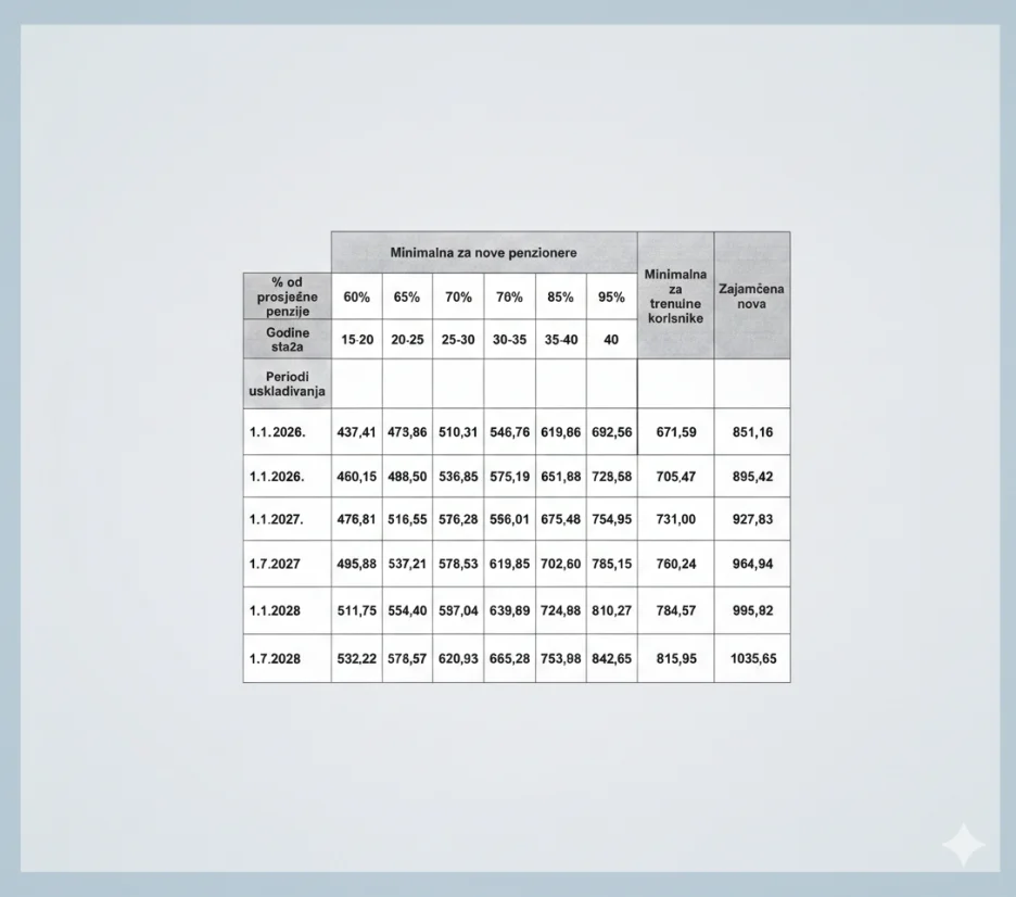 U suštini, ako se uzme u obzir da je prosječna penzija u Federaciji BiH u decembru 2025. godine iznosila 761,90 KM, to znači da bi minimalna penzija za osobu s 15 godina radnog staža iznosila 437 KM (od prvog jula 460 KM). Osoba, na primjer, s 21 godinu radnog staža imala bi minimalno 473 KM (od prvog jula 498). Ako je neko imao 26 godina radnog staža, imat će minimalno 510 KM (536 KM od prvog jula). Ako je neko imao 31 godinu radnog staža, imat će minimalno 546 KM (od prvog jula 575 KM) i ko je imao 36 godina radnog staža imat će minimalno 619 KM (651 KM od prvog jula). I ko je imao 40 godina radnog staža, imat će minimalno 692 KM (728 KM od prvog jula).