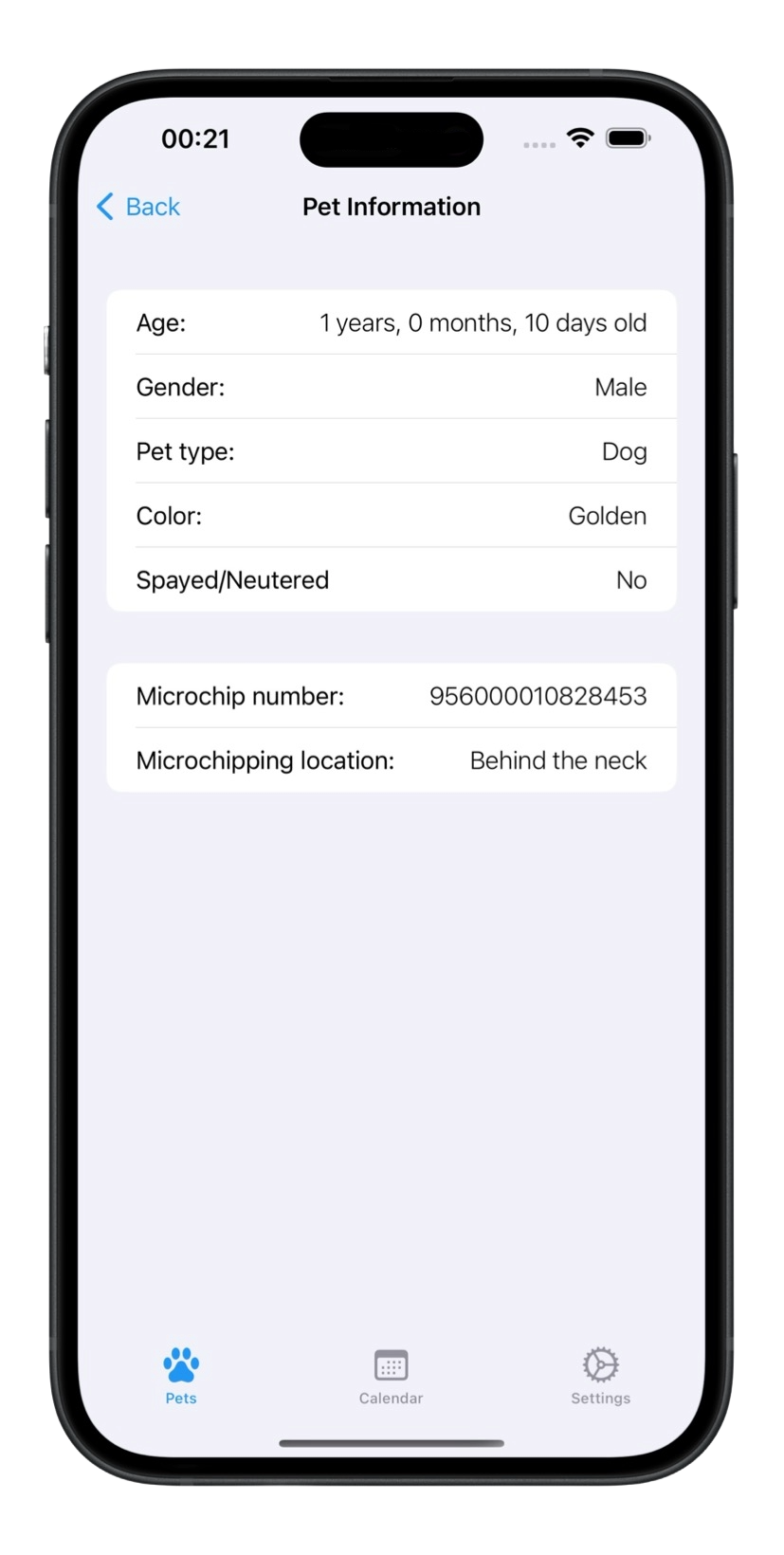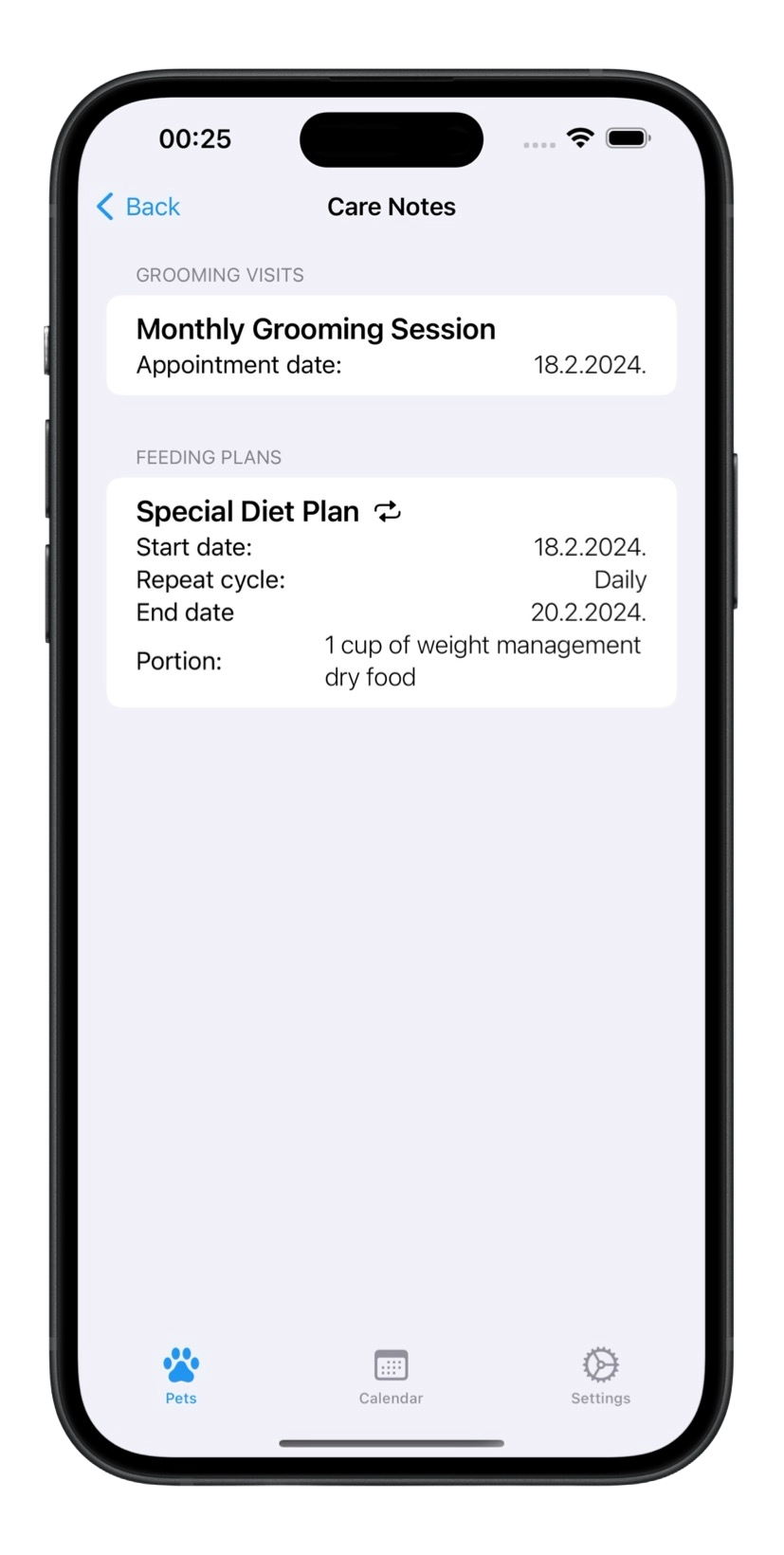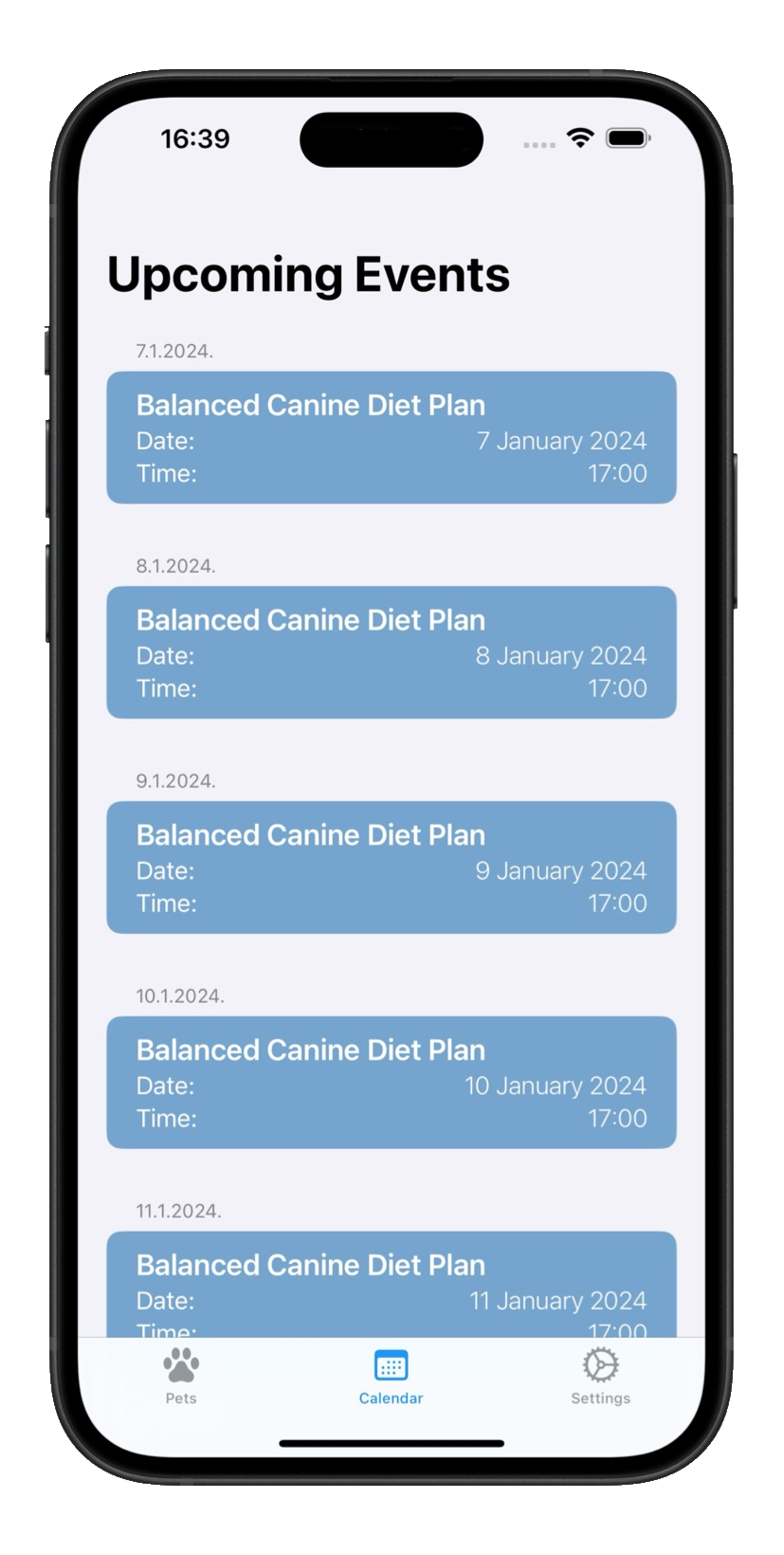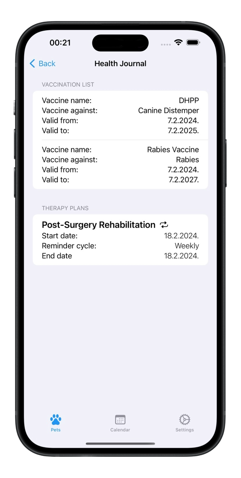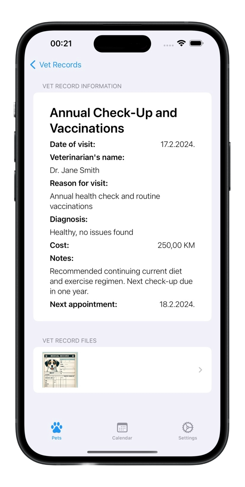 Upravljanje terminima: Zakazujte i nadgledajte posjete veterinaru, frizeru i terapijskim sesijama. Sinhronizujte s vašim kalendarom za podsjetnike.