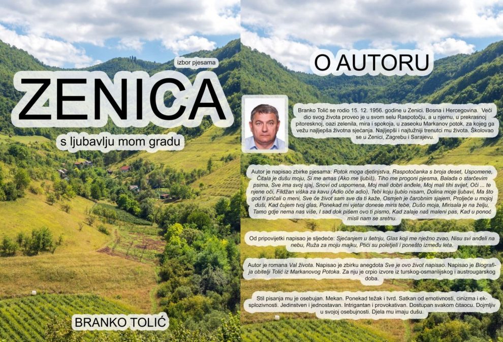 Zenicablog vam ovog vikenda poklanja neobičnu zbirku – pjesama o Zenici. Autor pjesama je naš sugrađanin Branko Tolić, a naš portal i obitelj Tolić se pobrinula da vam priredi jedinstveno čitanje pjesama, u elektronskoj priređenoj PDF formi.