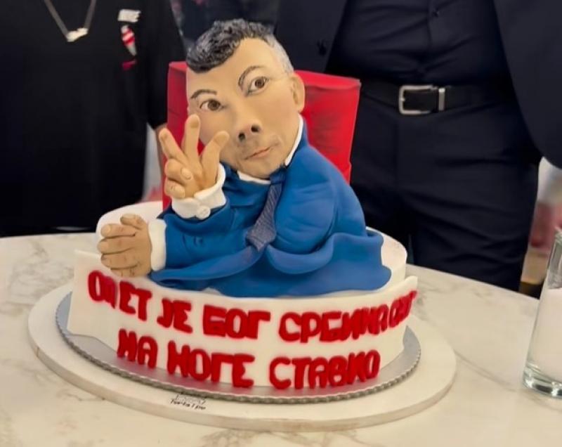 Bivši ministar sigurnosti Nenad Nešić nedavno je proslavio izlazak iz pritvora. Na derneku su se pjevale pjesme nacionalističkog drekavca Baje Malog Knindže i urlao refren: “Svaka bi fukara da ubije vuka”. Na slavlju je poslužena i rijetko ružna torta (na ilustraciji teksta), sa Nešićevim karikaturalnim likom koji podiže tri prsta i tekstom: “Opet je Bog Srbina svog na noge stavio”.