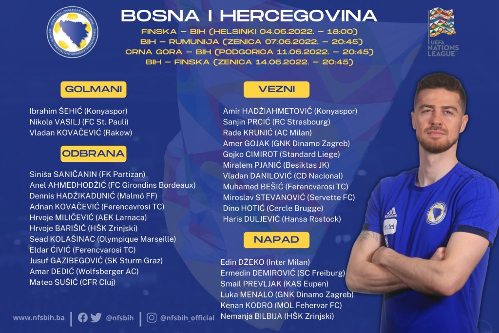 Bosna i Hercegovina će u junu odigrati sljedeće utakmice Lige Nacija: