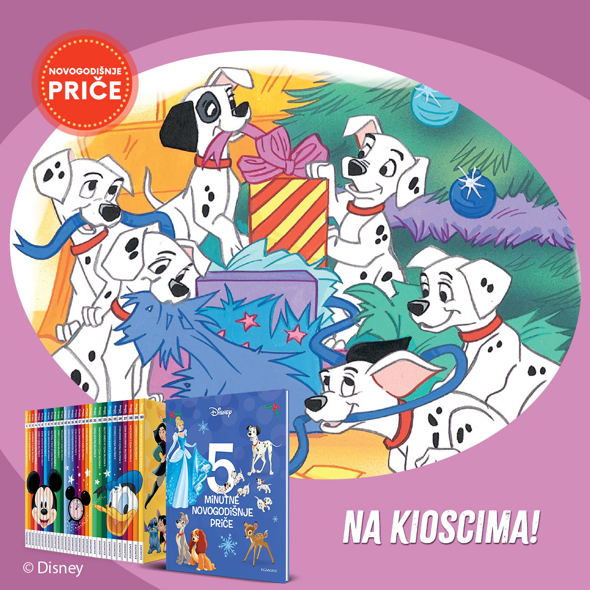 U knjizi Petominutne novogodišnje priče se nalazi pet novih priča. Bambi će sa svojim drugarom zekom Lupkom osjetiti čari zime, ali i prazan stomačić jer hrane nema baš u izobilju tokom zimskih mjeseci. Praznična čarolija donijet će im jedno sjajno iznenađenje u šumu! Brojna porodica pjegastih psića prvi put će zajedno dočekati Novu Godini i otvoriti mnoge poklone, ipak na kraju priče slatki dalmatinci shvatit će koji je poklon najvažniji od svih. Lunja će sa svojim štencima krenuti u potragu za idealnim poklonom za Mazu. Njihova avantura završit će se blistavo! Uz odličnu pouku i sretan kraj. Pepeljuga će provesti novogodišnju noć sa svojim prijateljima, pokazat će nam da je za dobar provod dovoljan osmijeh, volja, mašta i veliko srce. U svom stilu Robin Hud će sa družinom iz Šervudske šume uspjeti još jednom da nadmudri šerifa od Notingema smatrajući da svi zaslužuju da provedu ugodne praznike.