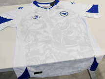 I gostujući dres, koji je u bijeloj boji, ima motive zmaja na sebi, što je prvi put da neki od proizvođača sportske opreme kreira specijalno za dres reprezentacije BiH, čiji je i nadimak Zmajevi. Gostujući dres ima detalje u plavoj boji na većinski bijeloj varijanti.