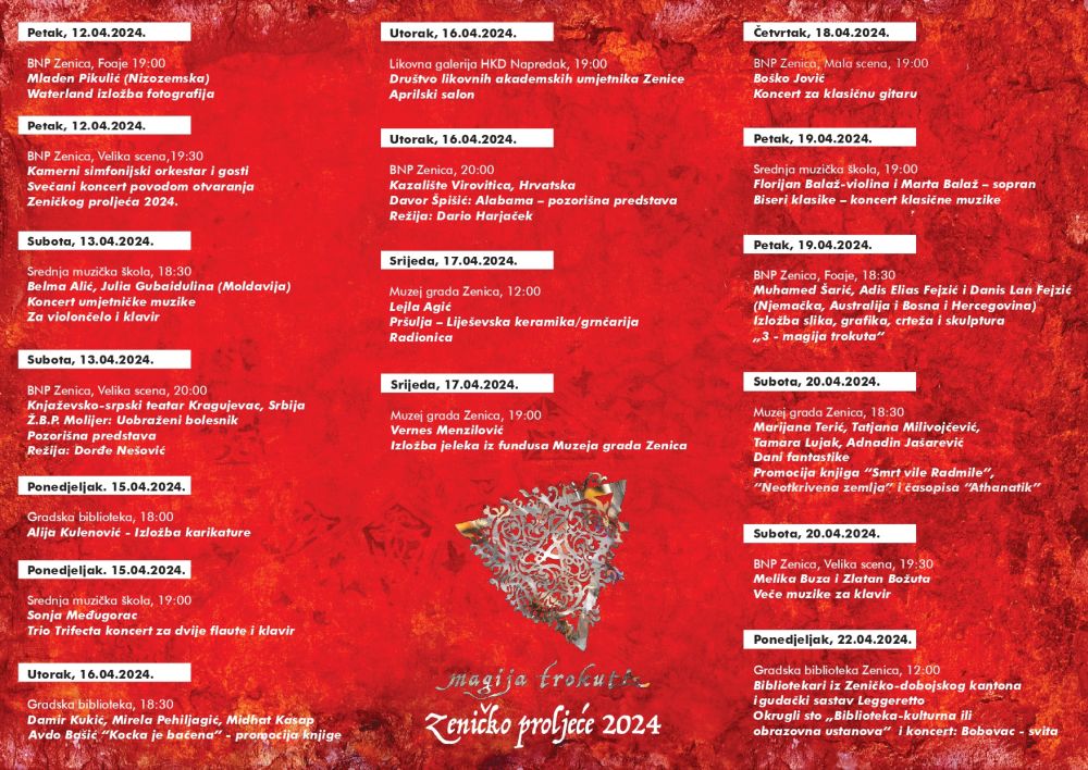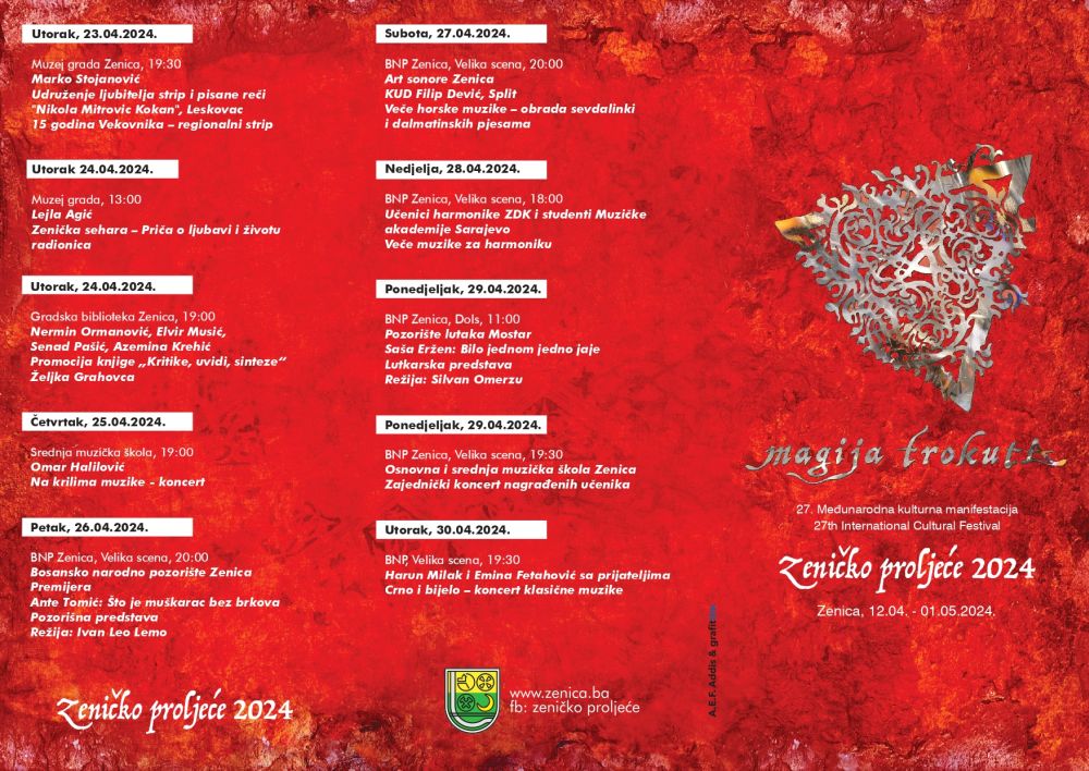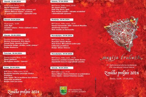 Međunarodna kulturna manifestacija “Zeničko proljeće” najavljuje svoje održavanje u Zenici od 12. aprila do 01. maja, obećavajući raznolikost i kvalitet u kulturi i stvaralaštvu.