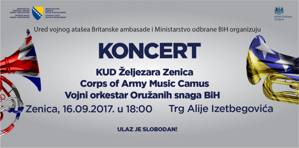 POKLON GRAĐANIMA BiH: Britanski vojni orkestar u saradnji sa orkestrom OS BiH nastupa u 5 bh. gradova – Čuveni Britanski Vojni orkestar CAMUS (Corps of Army music CAMUS), sačinjen od prvoklasnih muzičara koji nastupaju diljem svijeta, trenutno je u posjeti našoj zemlji, gdje će, zajedno sa Vojnim orkestrom Oružanih snaga BiH, održati 5 koncerata i to u gradovima: Zenica, Doboj, Tuzla, Sarajevo i Mostar. Osim koncerata, članovi CAMUS-a će održati i nekoliko radionica na muzičkim akademijama u Sarajevu i Banjaluci.