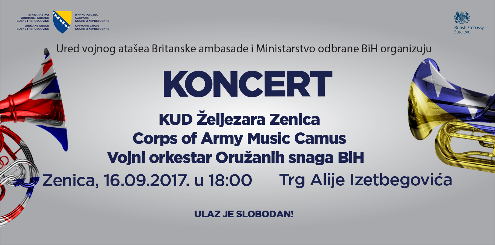 POKLON GRAĐANIMA BiH: Britanski vojni orkestar u saradnji sa orkestrom OS BiH nastupa u 5 bh. gradova – Čuveni Britanski Vojni orkestar CAMUS (Corps of Army music CAMUS), sačinjen od prvoklasnih muzičara koji nastupaju diljem svijeta, trenutno je u posjeti našoj zemlji, gdje će, zajedno sa Vojnim orkestrom Oružanih snaga BiH, održati 5 koncerata i to u gradovima: Zenica, Doboj, Tuzla, Sarajevo i Mostar. Osim koncerata, članovi CAMUS-a će održati i nekoliko radionica na muzičkim akademijama u Sarajevu i Banjaluci.