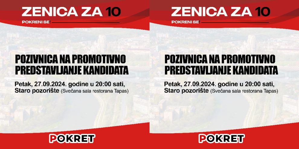 Politička organizacija „POKRET“ organizuje večeras (petak), 26.09.2024. godine u 20,00 sati promociju kandidata za Gradsko vijeće Zenica i kandidata za gradonačelnika Zenice.