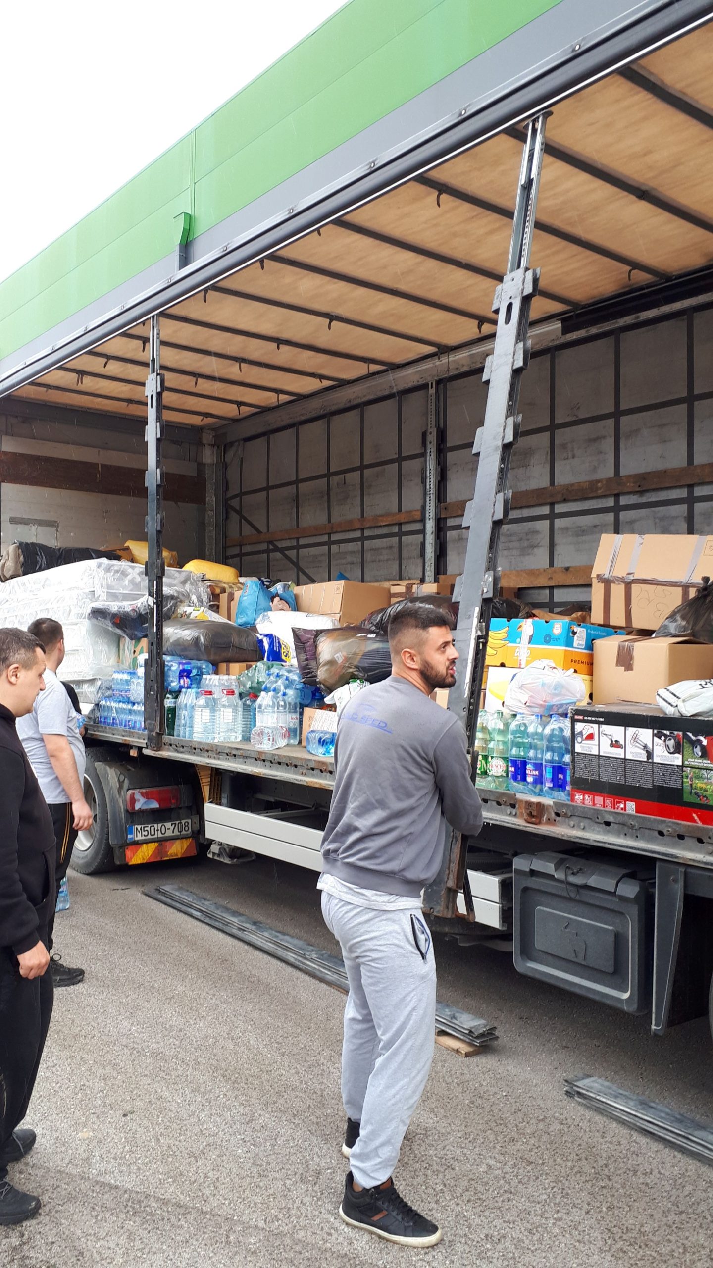 Prevoz interventne pomoći u vidu, prehrambenih i higijenskih artikala, zaštitne opreme, alata, odjeće i kreveta, jutros je krenuo iz Jelaha šleperom prevozničke firme A&D ŠPED iz Tešnja koja je također donirala prevoz.