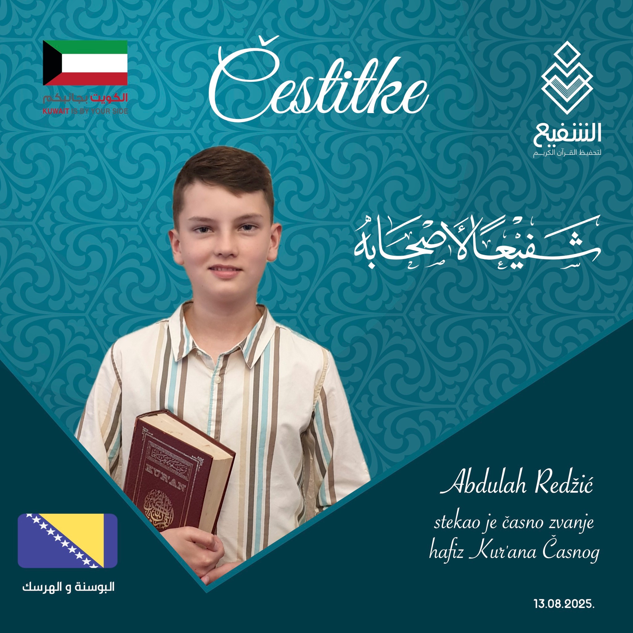 Abdulah Redžić iz mjesta Pojske kod Zenice 13. augusta 2025. godine pred Komisijom za hifz Rijaseta Islamske zajednice u Bosni i Hercegovini uspješno je završio hifz i stekao titulu hafiza Kur’ana.