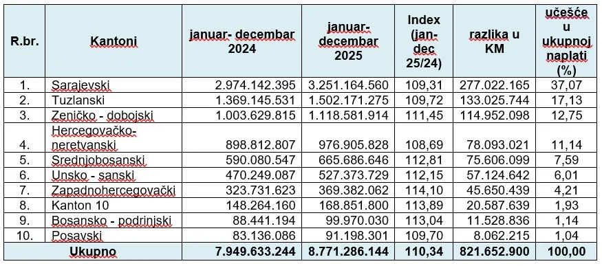 Kako su obavijestili, porezni obveznici Federacije BiH su u periodu januar – decembar 2025. godine uplatili rekordnih 8.771.286.144 KM javnih prihoda.