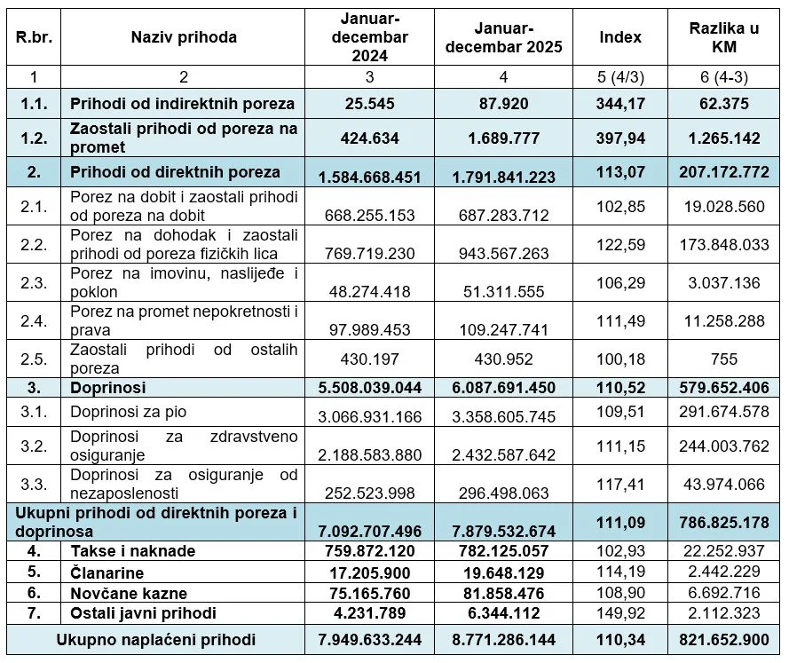 To je u odnosu na januar – decembar 2024. godine više za 821.652.900 KM, ili za 10,34 posto.