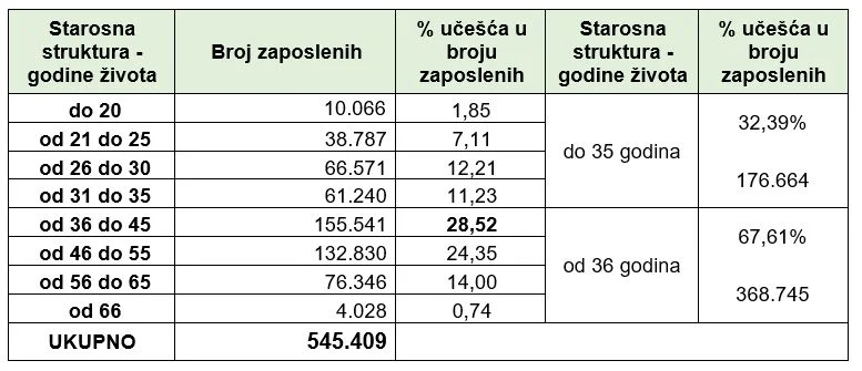 Broj zaposlenih prema prebivalištu zaposlenika na dan 31. decembra 2025. godine je 545.409. Prema službenim evidencijama Porezne uprave Federacije BiH na dan 31.12.2025. godine do 35 godina života zaposleno je 176.664, ili 32,39 posto, a preko 36 godina života zaposleno je 368.745 ili 67,61 posto. Na dan 31.12.2025. godine u Federaciji BiH zaposleno je 302.625, ili 55,49 posto muškaraca i 242.784, ili 44,51 posto žena.