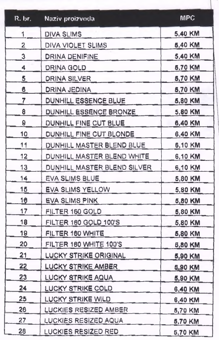 Uprava Društva TDR d.o.o Sarajevo je, naime, donijela Odluku o visini novih maloprodajnih cijena duhanskih proizvoda za tržište Bosne i Hercegovine koje će se primjenjivati od prvog dana marta.