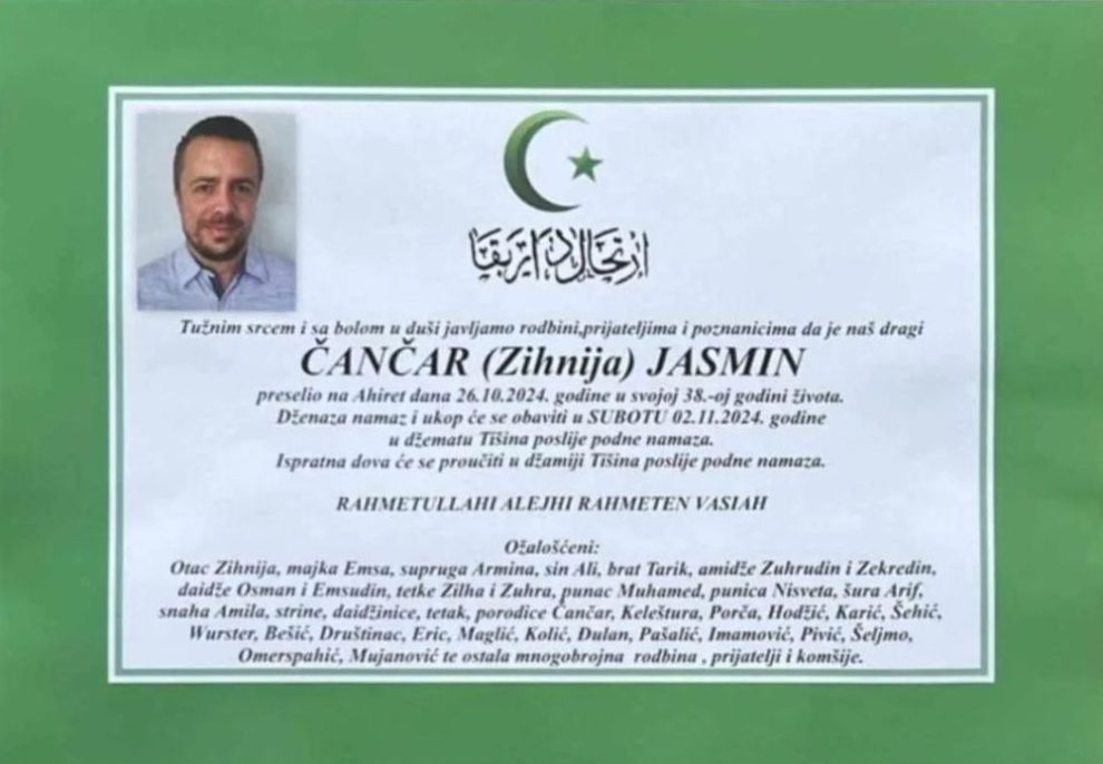 Posljednji ispraćaj: Sutra dženaza Jasminu Čančaru- Tridesetsedmogodišnji Jasmin Čančar iz Zenice pronađen je nakon što se nekoliko dana nija javljao porodici mrtav u svom stanu u Njemačkoj.