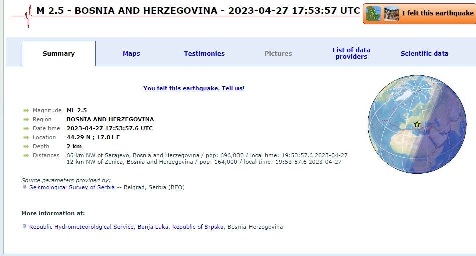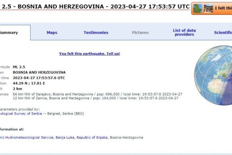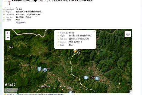 Zemljotres jačine 2,5 stepena prema Richteru potresao je u večernjim satima Bosnu i Hercegovinu.